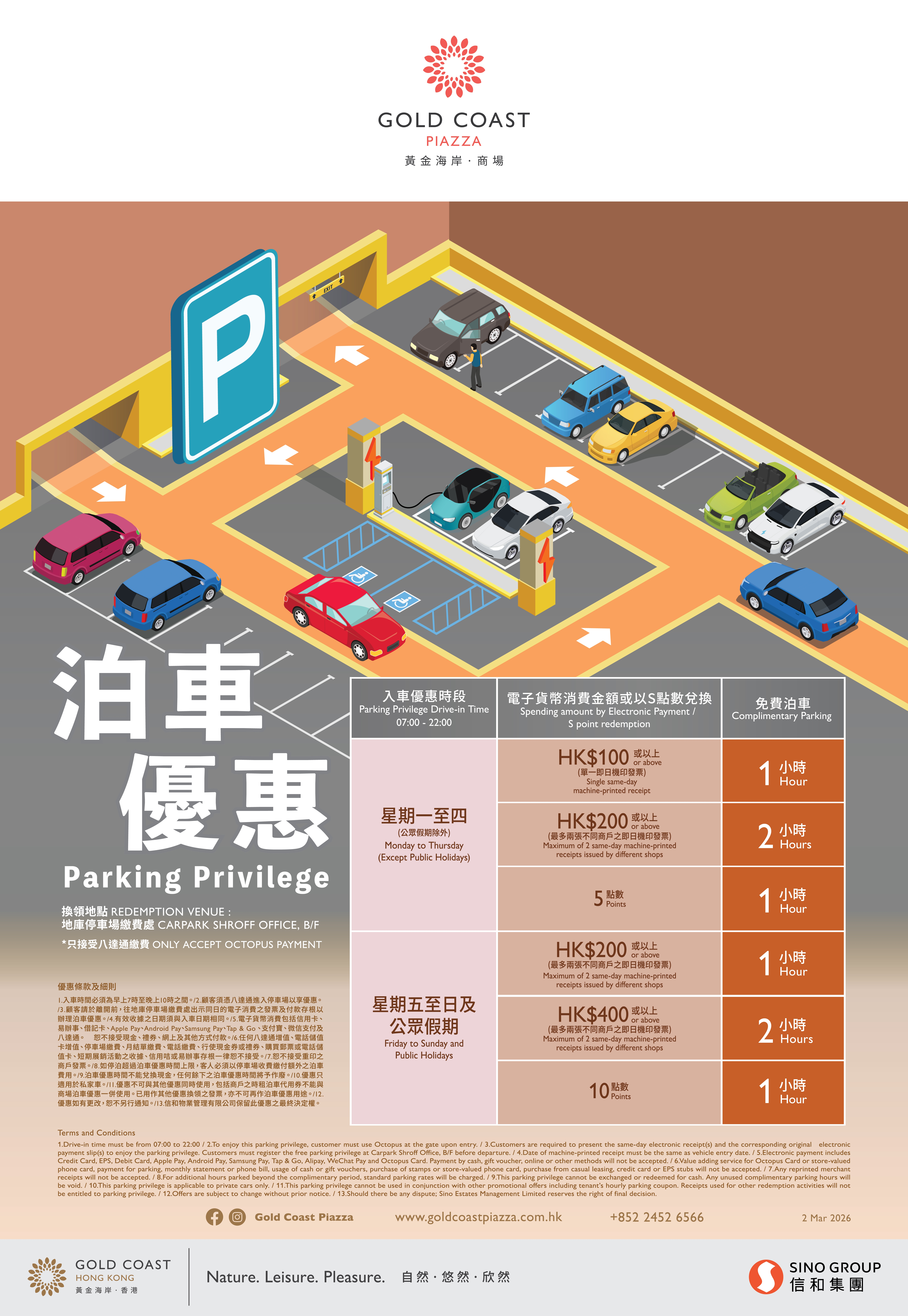 Upon spending of the specific amount by electronic payment at Gold Coast Piazza, shoppers can enjoy up to TWO hours free parking.