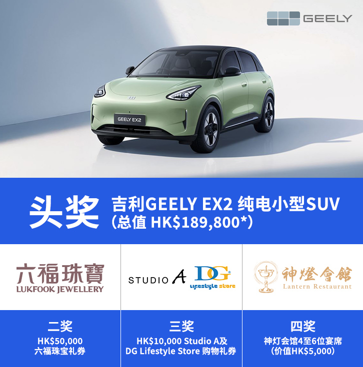 推广期内以Citi信用卡消费,累积金额最高的会员,更有机会赢取总值超过HK$320,000的「最高累积消费赏」!丰富奖品包括吉利GEELY EX2纯电小型SUV、六福珠宝礼券、Studio A及DG Lifestyle Store购物礼券、神灯会馆宴席及S现金券!