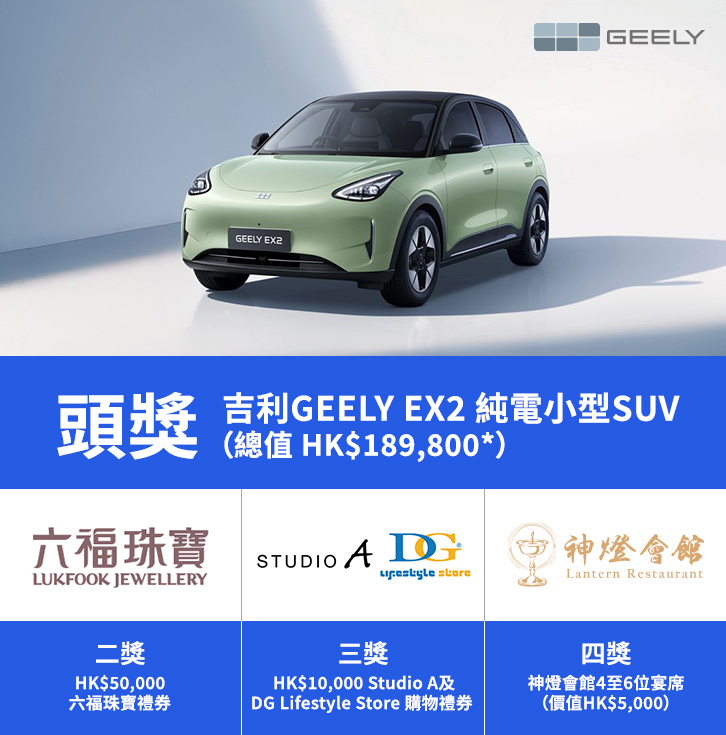 推廣期內以Citi信用卡消費,累積金額最高的會員,更有機會贏取總值超過HK$320,000的「最高累積消費賞」!豐富獎品包括吉利GEELY EX2純電小型SUV、六福珠寶禮券、Studio A及DG Lifestyle Store購物禮券、神燈會館宴席及S現金券!